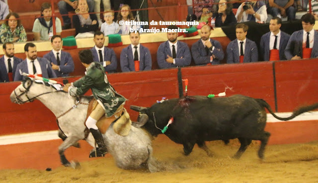 Noche negra de Parreirita Cigano, arrollados por el toro cavaleiro y caballo en un momento de la faena. Toques y desajustes en la lidia de su oponente marcaron el desempeño de Parreirita, que quiso resarcirse luego poniendo 3 banderillas "extra" autorizadas por el director de corrida. La absurda generosidad del inteligente llevó a Parreirita a creer que con sus 3 banderillas a mayores se había redimido de sus errores en la primera parte de su faena. Tan convencido quedó el cavaleiro que se creyó merecedor de dar la vuelta al ruedo y aprovechando -otra vez- la incomprensible generosidad del director de corrida que lo permitía, Parreirita dio la vuelta al Coliseu Figueirense, como si allí no hubiese pasado nada... Estas situaciones no benefician en nada a la Tauromaquia, mas siendo el cavaleiro un atrevido, ¿qué cabe decir del papel del director de corrida, tolerando lo que no debía de tolerar...?.