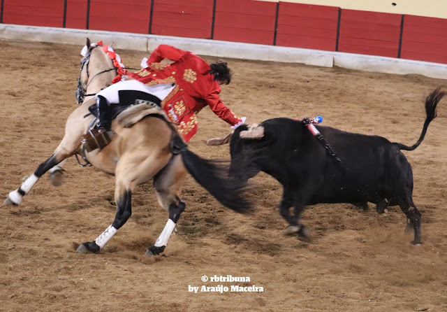 El toro número 45 de António Charrua cuyo peso no facilitó el señor speaker de la plaza -que ya podía haberse esforzado un poco más con esto de los pesos de los toros- que le correspondió a Bastinhas, tenía de salida fijeza, apuntaba ciertas condiciones interesantes que -se pensaba- podían ayudar a los propósitos del cavaleiro en su Toreo-Espectáculo. Pero el toro mudó un tanto su comportamiento tras los cumpridos... y sin llegar a rajarse, mostró que finalmente no era lo que parecía. Y aunque Marcos lo trabajó intensa y espectacularmente ya en la brega y lidia en la fase de cumpridos, la realidad es que llegado el momento de las banderillas y ferros curtos, empezó a cantar la gallina... porque aunque Bastinhas citó bien tras haber colocado en adecuado terreno al toro, resulta que este, cuando llegó el momento de la reunión, no acabó de definir, pareció reservón a la hora final de embrocar con el caballo, lo que obligó al cavaleiro a protagonizar -contra su voluntad- alguna acción con evidente distanciamiento al rematar la suerte... Se da cuenta enseguida Bastinhas, opta por intensificar rápidamente sus acciones dejando a un lado cierta base clasicista en su toreo; y apostando con toda rotundidad, en lo que siguió, por el espectáculo taurino puro y duro... y la mayoría del público, el sector más poblado, se lo agradecería con fuertes ovaciones. Ya hasta el final, tras dar la vuelta a las dificultades que el toro tendía a desarrollar, todo fue un clamor de los espectadores y un culminar faena en triunfo por parte del torero.