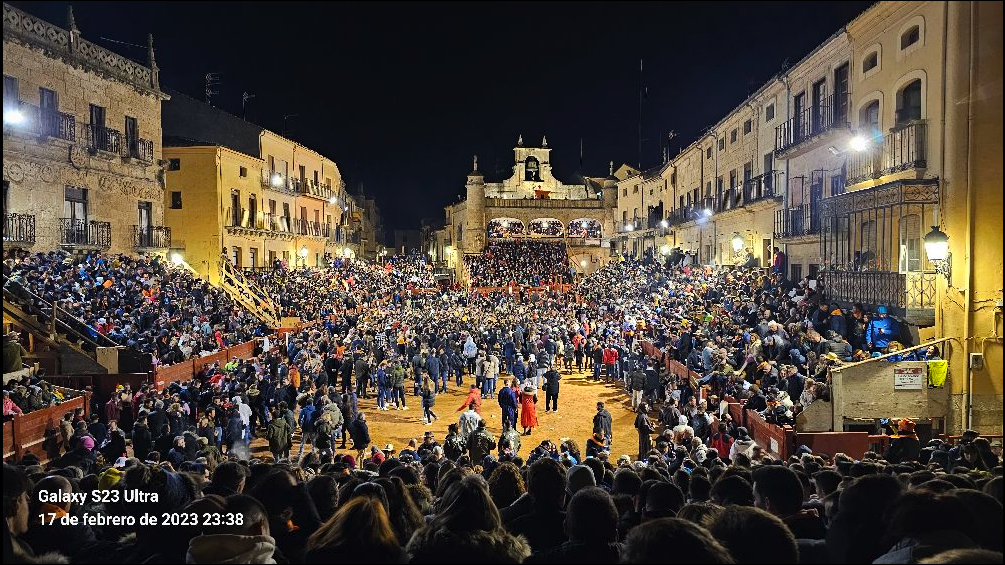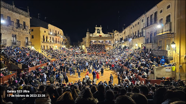 Ayllón Pérez es uno de los 5.000 miembros del club de amigos de la TRIBUNA da TAUROMAQUIA. Y desde Ciudad Rodrigo, esta noche, nos hace presentes esta magnífica fotografía de esta noche inicial del fin de semana, que es como levantar acta de que el famoso Carnaval del Toro ya está en marcha en la ciudad salmantina. Miles de personas inundan las calles en la primera de la jornada y ese es el aspecto, esta noche de viernes, de la plaza de toros que tradicionalmente se construye año a año para estos días de fiestas, donde el Toro es elemento fundamental y alrededor del cual todo gira...