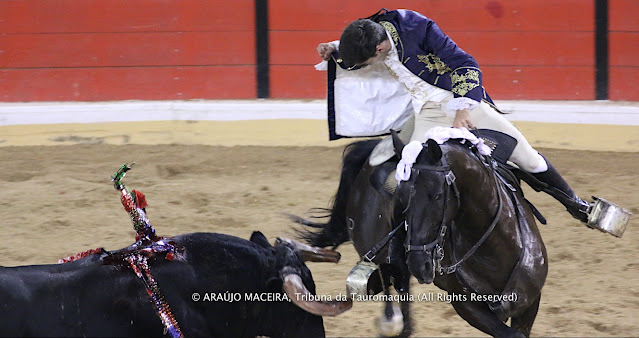 Moura, ya de salida, se hizo con el toro tras clavar a porta gayola y a partir de ahí lo fue encelando en una faena en la que el joven Miguel arriesgó notablamente en diversos lances, pues el toro no cabe duda que apretaba y perseguía con ahínco al caballo (que por otra parte es lo que cabe esperar de un toro realmente bravo). El ejemplar de Passanha, que fue el mejor toro de la corrida -por eso mereció la vuelta al ruedo el ganadero, cosa que hizo Diogo acompañando a cavaleiro y forcado-, fue correspondido con una faena por momentos vibrante a cargo de Miguel Moura que no escatimó esfuerzos a la hora de llegar al público, con un toreo en donde ofreció calidad, buen concepto de la lidia y colocaciones de ferragem y ejecución de las suertes en general buenas.