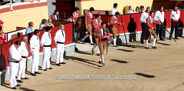Ya en estas cortesías de este domingo en Vila Franca llamó la atención la presencia del novillero jovencísimo, João Mexia -acompañado por su profesor, Cuqui-, de la Escuela Taurina de Moita, novillero que en este espectáculo asumió el papel de sobresaliente, por si le pasaba algo a Tomás Bastos en el transcurso de su actuación, cosa que felizmente no se produjo. A Mexia, aunque en un segundo plano, le vemos junto a Tomás Bastos, en las fotos de Araújo Maceira.