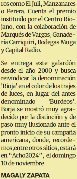 Inicio EL ÚLTIMO PARTE Trofeo tras trofeo... BORJA JIMÉNEZ no para de recibir premios rbtribuna www.tribunadatauromaquia.com y su suplemento periódico gratuito elaborado desde la propia web. Gracias por tu confianza y fidelidad. Muito obrigado. EL ÚLTIMO PARTE MAGALY ZAPATA Facebook Twitter