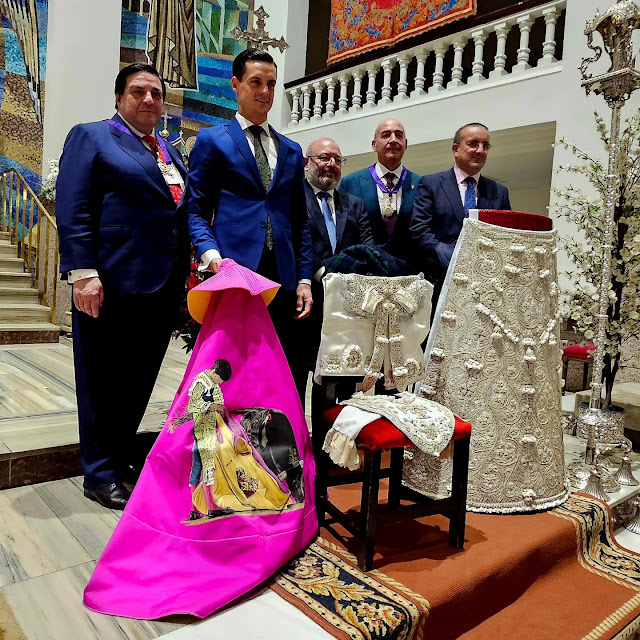 Pero la gran sorpresa que Mer Fidalgo se llevó por parte de quienes le encargaron el capote pintado para David Galván, fue hallarse con el mismo torero, presente en el acto de entrega de la que no deja de ser una obra de arte... "Lo que no pensé es que fuera a estar presente en la entrega del capote y mucho menos que ocurriera durante la misa celebrada en la Basílica de Jesús de Medinaceli", explicaba la pintora Mer Fidalgo, agradecida y espontánea como ella es en todo momento : "No me cansaré de daros las gracias @medinacelimadrid por todo lo que habéis hecho, hacéis y haréis conmigo". Y como era de esperar, tuvo palabras especiales en el acto del domingo y en las propias redes sociales dedicadas al torero : "@_davidgalvan eres un ser especial. Cuando empecé con la idea de "Revoleras de Colores" siempre tuve claro que quería que formaras parte del proyecto y aquí estamos. Ya eres parte especial de "Revoleras", "Revolero de honor". Desde el primer minuto que viste mi trabajo has querido formar parte de él, me has apoyado, difundido y disfrutado con los talleres infantiles como si fueran tuyos. Estarás en las exposiciones que yo haga en un lugar destacado; pero por lo pronto en tu casa hay un capote que te ha regalado la Archicofradia -y en especial @mai7728- que lleva mucho de mi. Gracias por tanto como haces. Nos vemos pronto por las plazas, o pintando con los peques..."